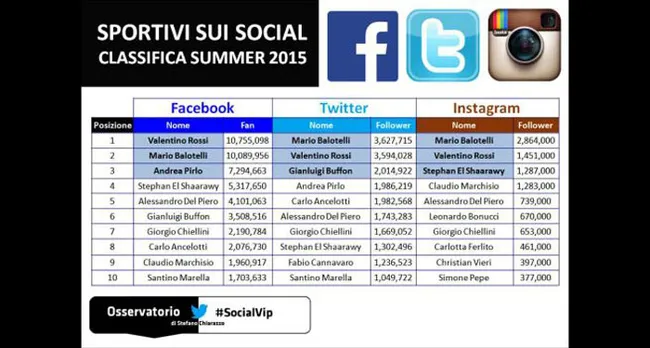 Pebalap Movistar Yamaha MotoGP, Valentino Rossi terbukti sebagai salah satu olahragawan Italia paling populer di dunia, dan Osservatorio Social Vip, yakni forum pengawas media sosial Italia membuktikannya sekali lagi lewat pengamatan di Facebook, Twitter dan Instagram.