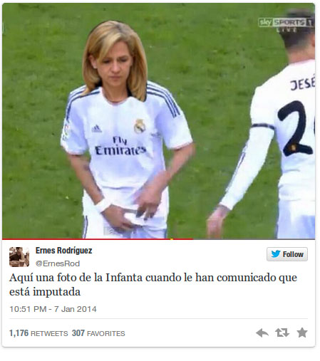 Ya, gambar dari putri termuda Raja Juan Carlos - Infanta Cristina (48) yang sudah di-edit dan tampak meniru pose Di Maria kini sudah beredar luas di seantero negeri matador, bersama dengan foto hasil rekayasa lainnya. Penyebabnya, sang Putri baru saja mendapat panggilan pengadilan karena tuduhan penipuan, penggelapan pajak, serta pencucian uang.