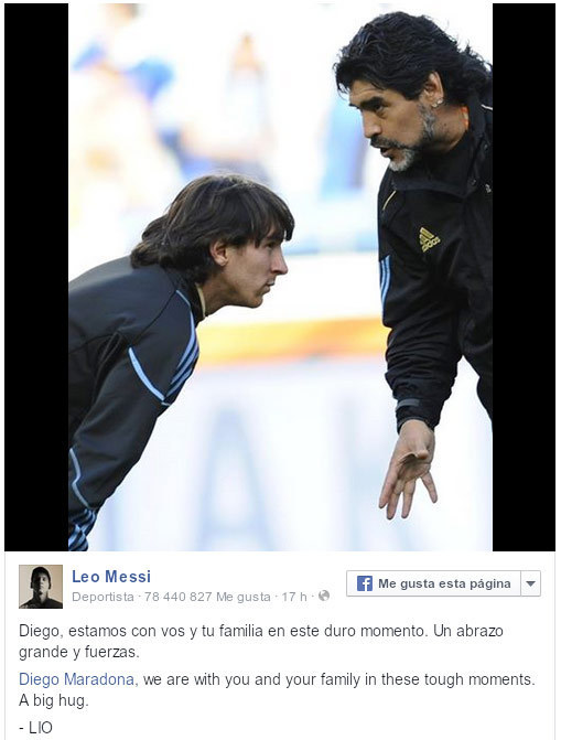 Messi, yang dilatih Maradona di Piala Dunia 2010 dan saat ini sedang berada di Chile bersama timnas Argentina untuk Copa America 2015, menyampaikan ucapan dukacitanya. Messi menyampaikannya lewat Facebook.