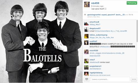 Mantan striker AC Milan itu belum lama ini mengubah foto dari para personil band legendaris asal Liverpool, 'The Beatles', menjadi wajah dirinya di Instagram. Balotelli juga mengubah nama band menjadi 'The Balotells' dan menuliskan kalimat: We are Five, seperti yang bisa dilihat di bawah ini: