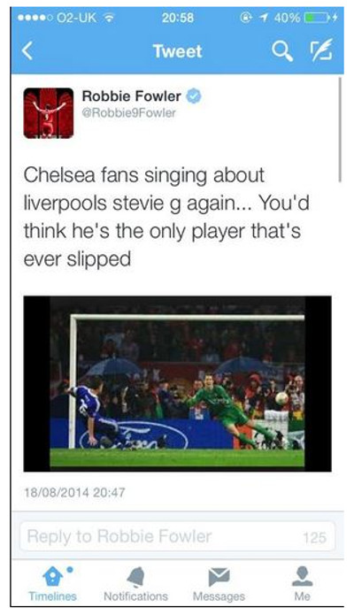Dijadikannya insiden tersebut sebagai lelucon oleh fans Chelsea rupanya membuat telinga salah satu legenda Liverpool, Robbie Fowler, gatal. Melalui akun Twitternya, ia berusaha membalas serangan fans The Blues dengan menyindir insiden serupa yang melibatkan kapten Chelsea, John Terry.