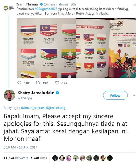 Khairy Jamaluddin, Menpora Malaysia menyatakan permintaan maaf itu dengan membalas twit Imam Nahrawi. "Bapak Imam, tolong terima permintaan maaf yang tulus dari saya. Sesungguhnya tidak ada niat jahat dari kami. Saya sendiri juga sangat kesal dengan kesalahan ini. Mohon maaf."