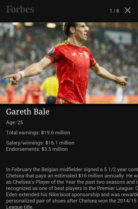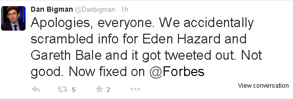 Forbes merilis sebuah artikel tentang daftar atlet berusia maksimal 25 tahun dengan bayaran terbesar di dunia. Hanya sayang, di keterangan tentang Hazard (Chelsea), foto dan nama pemainnya justru tertukar dengan Bale (Real Madrid).