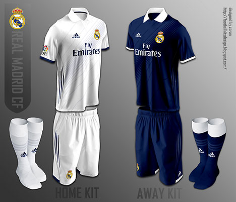 Untuk desain jersey tandang semuanya hampir mirip dengan jersey kandang, yang membedakan hanyalah warnanya. Jika jersey home menggunakan warna dominan putih khas Los Blancos, maka untuk jersey away menggunakan warna biru navy alias biru gelap.
