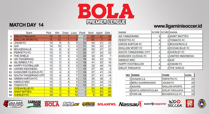 Bola.net - Dua tim teratas di klasemen Bola Premier League berhasil melebarkan jarak dengan tim di bawah mereka. Diklat Pakujaya dan Dhillon Sports yang sama-sama memimpin klasemen berhasil meraih poin penuh guna mempertahankan posisi mereka.