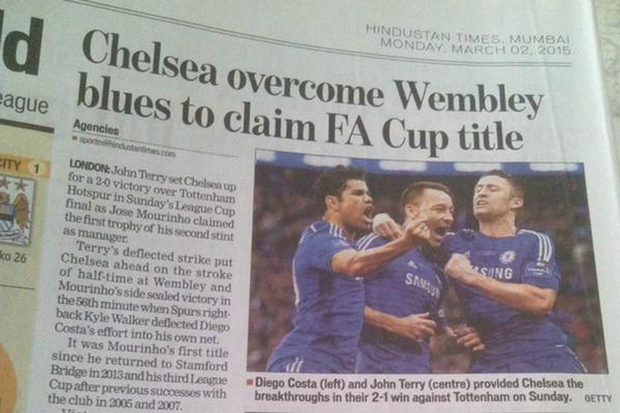 Demikian menurut laporan yang diturunkan oleh surat kabar Hindustan Times of Mumbai, yang sempat menulis bahwa Chelsea menang 2-0 atas Tottenham di Wembley dan menjuarai Piala FA, alih-alih Piala Liga.