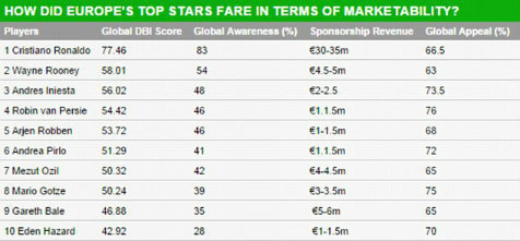 Ia memimpin jauh di atas Kapten Manchester United, Wayne Rooney yang berada di peringkat kedua. Rooney, satu-satunya pemain asal Inggris di daftar ini, hanya mengoleksi 58.01 DBI. Pemain 29 tahun ini hanya mampu menghasilkan uang dari para sponsor sebesar 4.5 hingga 5 juta Euro per tahunnya.