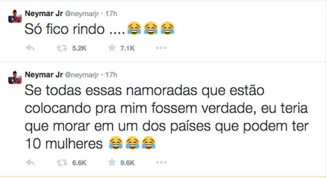 "Jika semua pacar yang dikaitkan dengan saya benar adanya, maka saya harus hidup di negara di mana kita bisa memiliki 10 wanita." demikian reaksi Neymar yang diakhiri dengan emoticon smile.