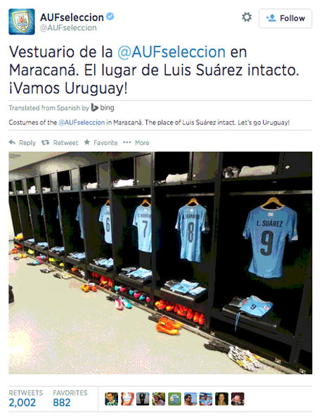 Namun hukuman tersebut rupanya tak menghentikan niat skuat La Celeste untuk menghadirkan sosok El Pistolero di tubuh tim. Federasi Sepakbola Uruguay melakukannya dengan cara tetap memajang jersey nomor 9 milik Suarez di kamar ganti tim mereka.