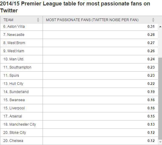Perusahaan asal Inggris tersebut mempelajari jumlah tweet yang dikirimkan oleh fans pada akun resmi klub kesayangan mereka, dan semua tweet tersebut lantas diklasifikasikan sebagai respon positif dan negatif.