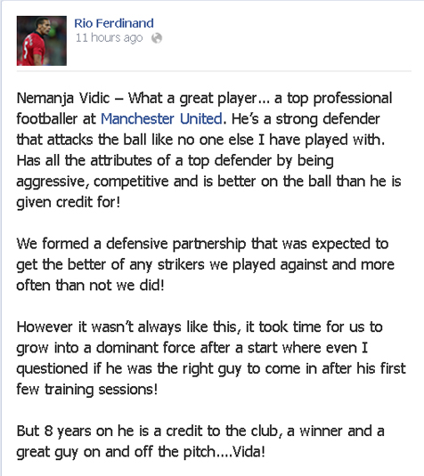 Dalam pesan singkat tersebut, Ferdinand mengungkapkan pujian dan juga bersyukur karena pernah bermain bersama Vidic sebagai duet bek tengah United. Ferdinand juga menyatakan bahwa pada awalnya ia sempat meragukan kemampuan Vidic sebagai seorang defender.