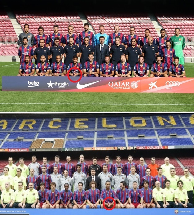 Namun ada yang menarik dari sesi foto tersebut. Salah seorang pemain bintang Blaugrana, Neymar, menggunakan pose yang sama persis dengan kompatriotnya, Ronaldinho.