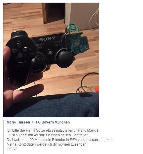 Hal tersebut membuat ia frustrasi dan merusak gamepad yang ia punya. Tak cukup sampai di situ, Thissen juga menulis pesan yang ditujukan pada Facebook Bayern Munchen, menuntut ganti rugi atas kerusakan yang ia alami.