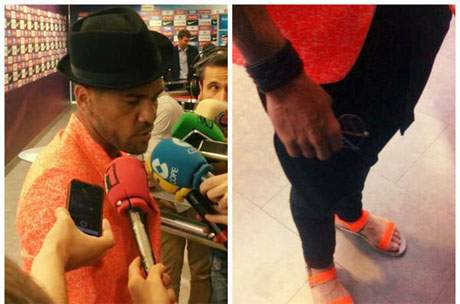 Bola.net - Dani Alves menemui wartawan yang menanti dirinya usai Barcelona mengalahkan Elche di laga perdana La Liga (24/8), dengan gaya pakaian yang unik.