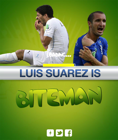 Bola.net - Gigitan kontroversial striker Uruguay, Luis Suarez terhadap bek Italia, Giorgio Chiellini terus menuai reaksi dari penjuru dunia. Tak sedikit pula karya kreatif yang muncul di internet menyusul insiden gigitan tersebut, salah satunya adalah demam 'Suarezing' yang melanda jejaring sosial Twitter.