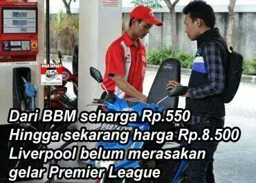 "Dari BBM seharga Rp550 hingga sekarang Rp8.500, Liverpool belum merasakan gelar Premier League," demikian bunyi tulisan dalam meme tersebut.