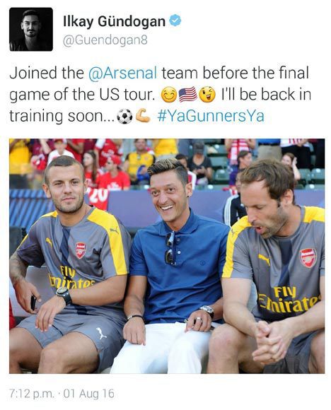 Akun Twitter milik Gundogan tiba-tiba menulis situasi Ozil plus foto Ozil yang sedang bersama Jack Wilshere dan Petr Cech. Ozil memang belum bergabung dengan latihan Arsenal karena masih liburan usai Euro 2016.
