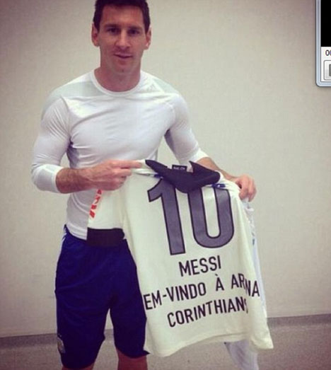 La Pulga pun kemudian menerimanya dan berfoto dengan jersey yang juga dibubuhi nomor punggung 10 dan tulisan, "Messi, Selamat Datang di Arena Corinthians,".
