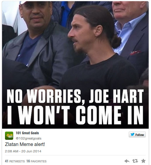 Akun Twitter 101 Great Football contohnya. Mereka menuliskan kalimat 'Jangan khawatir Joe Hart, saya tidak akan bermain', sebagai bentuk lelucon terhadap aksi spektakuler Ibra, yang mencetak gol salto luar biasa dari jarak jauh kala kedua negara saling bertemu di laga uji coba tahun lalu.