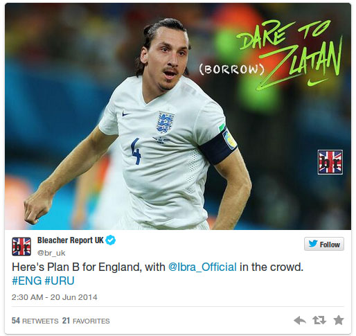 Lain lagi dengan Bleacher, yang memilih untuk mengolah gambar Ibra, hingga membuatnya terlihat mengenakan seragam Inggris. Rupanya tim asuhan Roy Hodgson diminta untuk 'meminjam' sang striker guna mengatasi sulitnya mereka menjebol jala lawan di Piala Dunia kali ini.