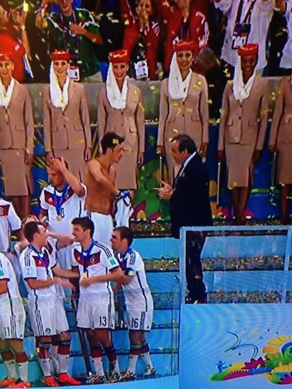 Platini, mantan pemain no.10 Prancis dan juga Presiden UEFA saat ini, meminta jersey yang dikenakan Ozil di partai final, kala rekan-rekan setimnya di Der Panzer sedang merayakan sukses mereka meraih trofi juara di podium, seperti yang Bolaneters bisa lihat di bawah ini.
