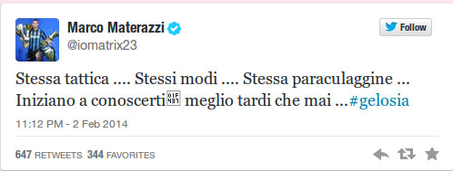 Ia menyebut Benitez sebagai orang yang bebal dengan menggunakan taktik yang sama berulang-ulang. Materazzi menulis: 'Taktik yang sama...Cara yang sama...kebebalan yang sama...Mereka mulai mengetahui tentang dirimu. Lebih baik terlambat daripada tidak sama sekali."