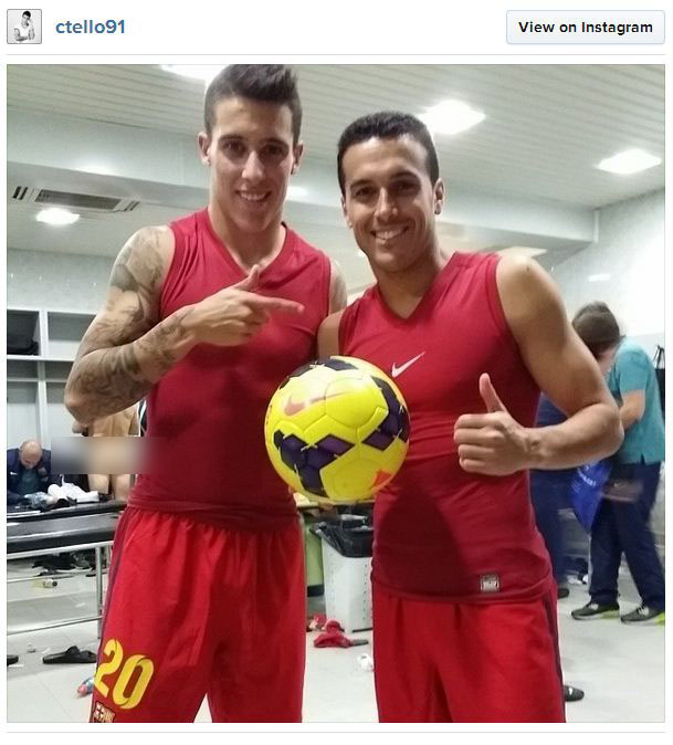 Bola.net - Ada yang tak biasa di foto yang baru saja diunggah oleh Cristian Tello di akun instagram-nya, menyusul kemenangan Barcelona 5-2 atas Getafe di La Liga dini hari tadi. Jika dilihat sepintas, memang tak ada yang aneh dari gambar Tello, yang berpose dengan Pedro Rodriguez di ruang ganti.