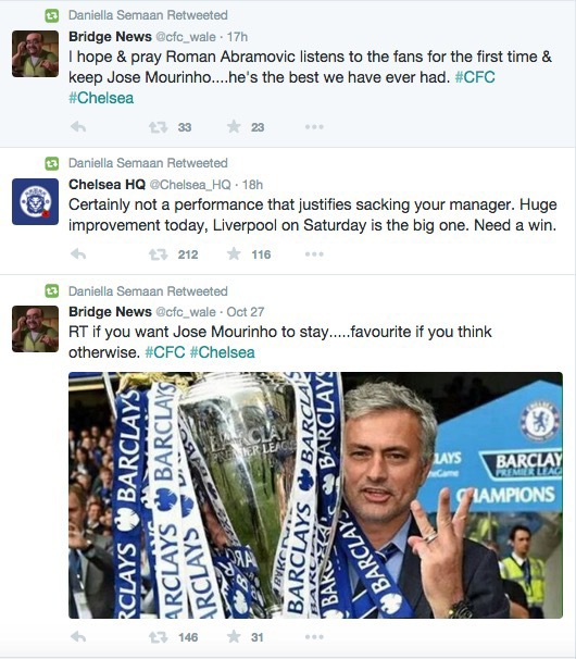 Seperti yang terlihat dalam gambar di bawah ini, Daniella secara aktif me-RT berita-berita atau kabar yang memberikan dukungan positif pada The Special One, seolah berharap agar sang bos tak angkat kaki dari klub dalam waktu dekat.