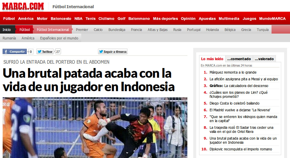 Dalam laporan singkat mereka, kepergian penyerang bernomor punggung 17 tersebut digambarkan dengan mengenaskan. Betapa tidak, Marca menulis dengan judul: 'Sebuah Tendangan Brutal Membunuh Seorang Pemain di Indonesia'.