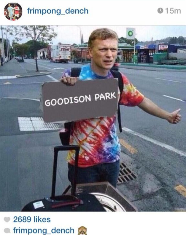 Dalam gambar Instagram yang sudah diedit tersebut, terlihat Moyes sedang mencari tumpangan untuk kembali ke Goodison Park, markas klub lamanya - Everton.