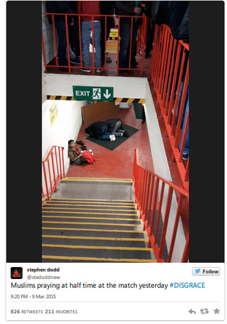 Selain mengunggah foto, fans yang diketahui bernama Stephen Dodd itu juga menuliskan kalimat bernada ofensif: "Muslim berdoa di istirahat babak pertama #DISGRACE (memalukan-red)."