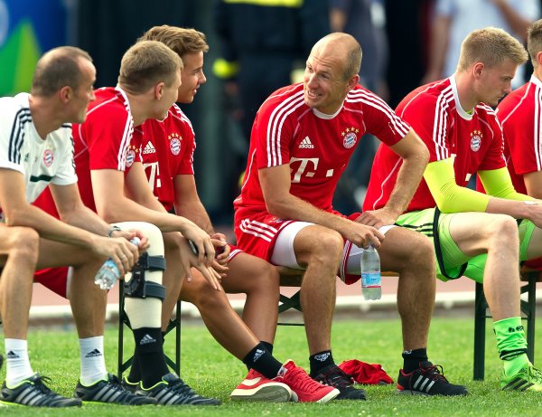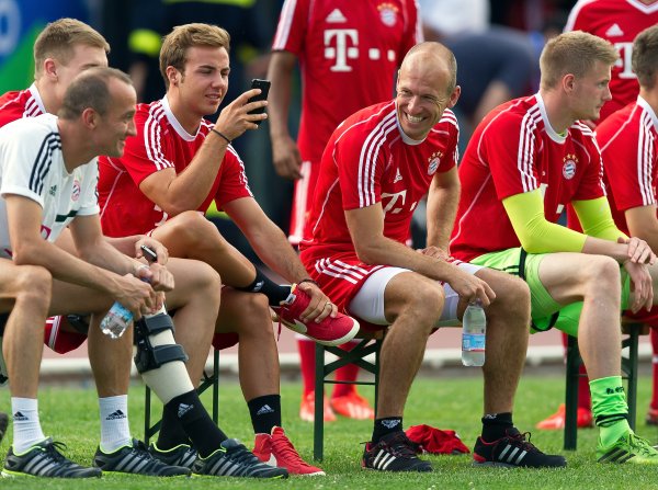 Sementara dalam foto lain, Gotze juga terlihat mengenakan sepatu Nike yang sama saat berbincang dengan Arjen Robben di sesi latihan.