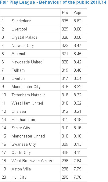 Sementara itu, suporter Sunderland terpilih sebagai suporter terbaik musim ini. Mereka mengungguli Liverpool dan Crystal Palace yang finis di posisi dua dan tiga. Berikut daftarnya.