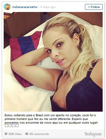 Seperti yang bisa Bolaneters saksikan di bawah ini, Indianara tengah berpose dengan sebuah kaus berwarna biru-merah khas Barcelona. Tak lupa, ia juga menuliskan pesan: "Saya akan pulang ke Brasil dengan hati gundah, kamu adalah pria pertama yang mampu membuat saya merasa berbeda. Saya harap kita bisa bertemu lagi di tempat lain!"