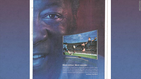 Oktober tahun lalu, Samsung memasang sebuah iklan di koran New York Times dengan wajah seorang pria yang berwajah sangat mirip Pele. Sementara pada tampilan televisi terlihat seorang pemain melakukan tendangan gunting yang juga sangat khas Pele.