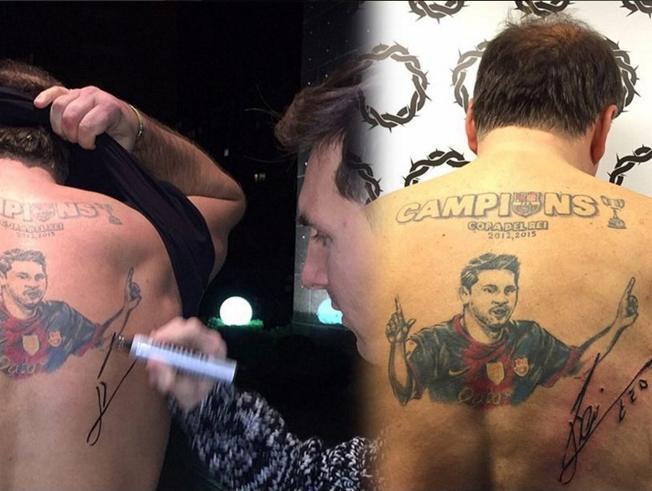 Tentu saja Messi dibuat terkejut dengan hal tersebut. Namun tak lama kemudian, La Pulga berhasil menguasai dirinya dan memberikan apresiasi pada sang fans, serta memberikan tanda tangan pada tato yang juga bertuliskan 'Juara Copa Del Rey 2015' tersebut.