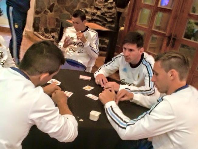 Bola.net - Lionel Messi ternyata memiliki hobi bermain kartu. Hal tersebut terlihat kala sang pemain menghabiskan waktu senggang usai berlatih, sebelum laga melawan Paraguay di semifinal Copa America 2015 pagi tadi.