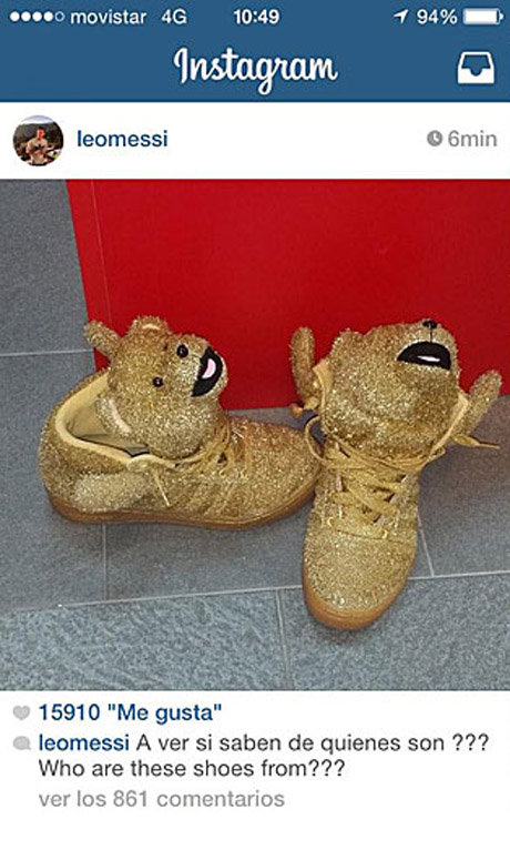 Messi menggunakan akun Instagram miliknya untuk menggunggah foto sepatu berwarna emas, yang dihiasi dengan boneka berbentuk kepala anjing. Ia lantas menulis pesan untuk mengajak para penggemarnya menebak siapakah pemilik sepasan sepatu unik ini.