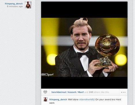 Frimpong yang memang terkenal suka mengeluarkan lelucon di dunia maya, mengolok Bendtner dengan memajang foto striker asal Denmark tersebut sedang memegang trofi bola emas.