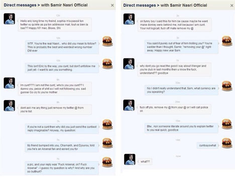 Sebelumnya rumor mengenai keributan ini mencuat setelah seorang pendukung The Gunners, Sir Hamburgooner menunjukkan bukti bahwa ia terlibat perang mulut dengan Nasri lewat Direct Message Twitter.