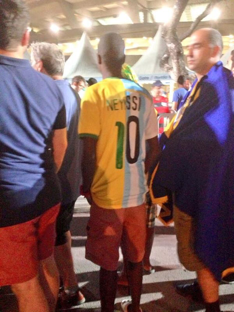 Ya, karena tak ingin bingung memilih mendukung Neymar atau Messi, pria ini pun menggabungkan dua jersey Brasil dan Argentina bernama punggung kedua pemain menjadi satu. Nama punggungnya pun berubah menjadi Neyssi!