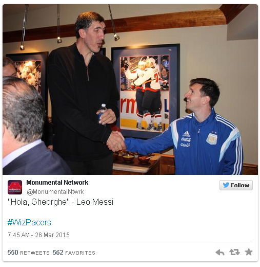 Tak hanya itu, Messi juga melakoni sebuah sesi foto canggung bersama eks pemain basket kawakan Washington, Gheorge Muresan. Messi nampak terlihat mini saat bersalaman dengan pria asal Rumania bertinggi 231 cm tersebut.