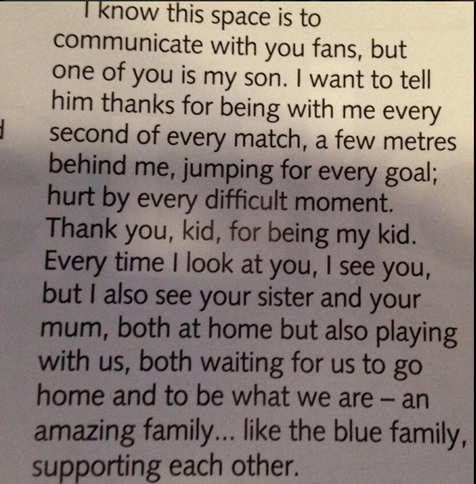 Saya ingin menyatakan terima kasih kepadanya, yang telah mendampingi saya di setiap laga. Ia berada beberapa meter di belakang saya, melompat tiap kali terjadi gol, dan ikut tersakiti di masa-masa sulit.