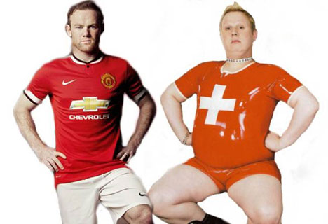 Gaya Rooney dengan jersey tersebut disamakan dengan seorang karakter dari serial TV ternama garapan BBC, Little Britain bernama Daffyd Thomas. Berikut perbandingannya.