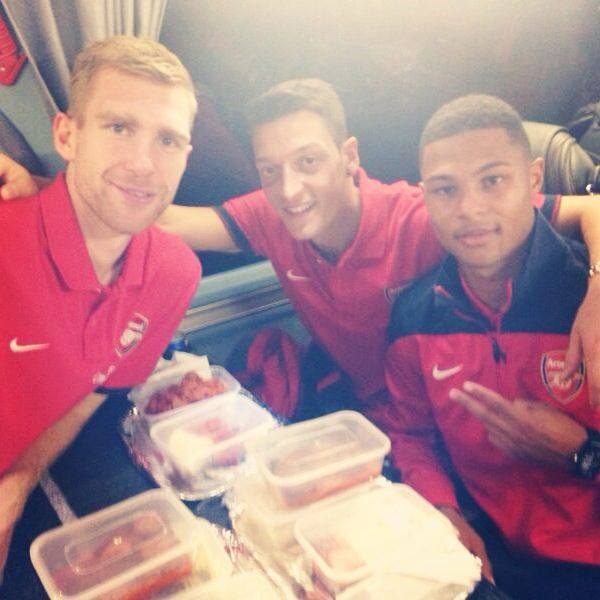 "Perayaan sebelum hari ulang tahun di dalam bus setelah kemenangan 2-1 atas Swansea. Perolehan saat ini: 3 poin dan #topoftheleague. Selamat ulang tahun, Per Mertesacker"