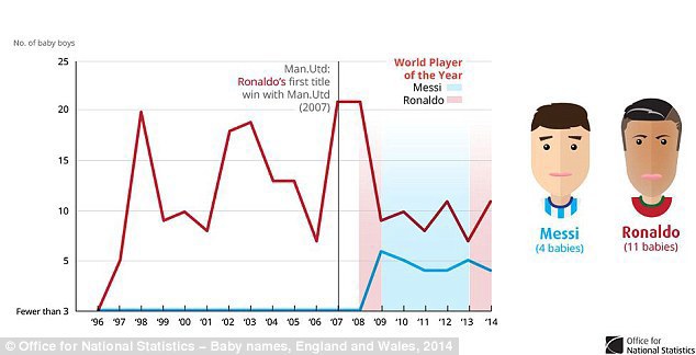 Statistik yang dikeluarkan oleh Badan Statistik Nasional Inggris mengungkap bahwa ada total empat bayi yang diberi nama Messi di tahun 2014, sementara ada 11 bayi yang mendapat nama Ronaldo.