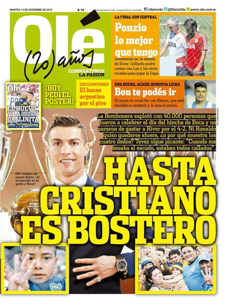 Ole menganggap pose empat jari Ronaldo merupakan sebuah gestur yang berhubungan dengan kemenangan Boca Juniors. Dalam sub-judul, Ole menuliskan 'Mengapa Ronaldo mengacungkan 4 jari?'