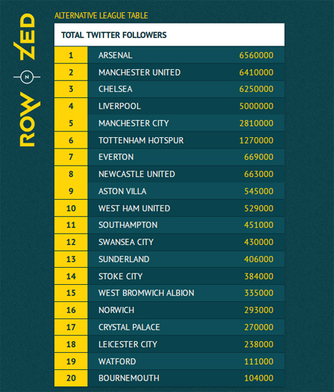 The Gunners ada di puncak klasemen dengan jumlah pengikut mencapai 6,5 juta. Mereka diikuti oleh Manchester United, yang punya jumlah pengikut 6,4 juta. Sementara itu, juara Premier League musim lalu, Chelsea, ada di peringkat empat dengan jumlah follower mencapai 6,25 juta.