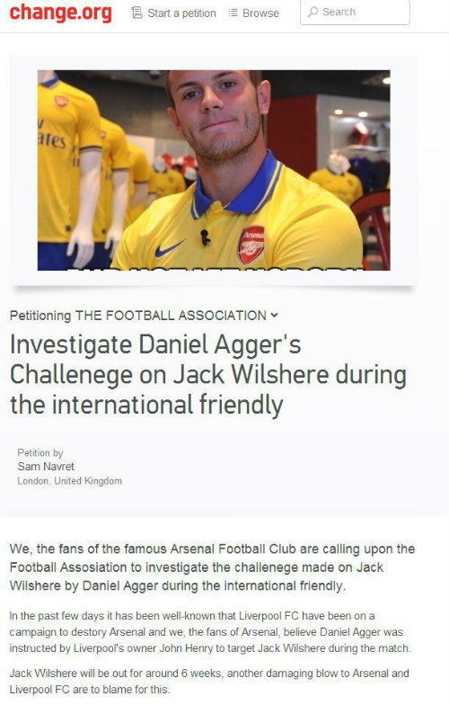 Setelah sebelumnya mendesak agar klub Merseyside tersebut melepas Luis Suarez dengan gratis ke Arsenal, kini, ia membuat petisi lain yang mendesak agar FA menginvestigasi bek The Reds, Daniel Agger, karena telah mencederai Jack Wilshere.