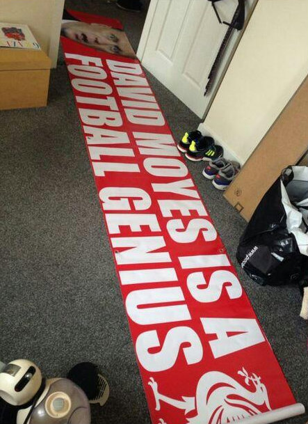 Para pendukung Liverpool tersebut menyiapkan sebuah banner bertuliskan 'David Moyes Is A Football Genius,' yang artinya kira-kira adalah Moyes adalah sosok yang jenius dalam sepakbola. Banner itu sendiri muncul lebih awal melalui Twitter.